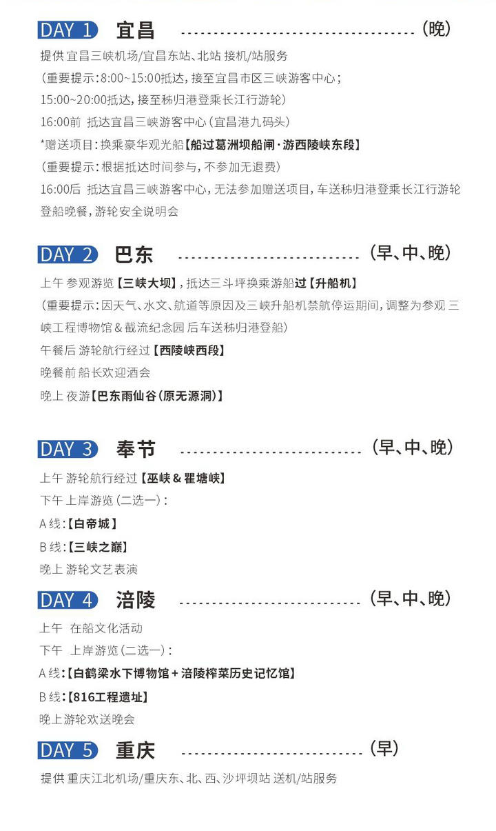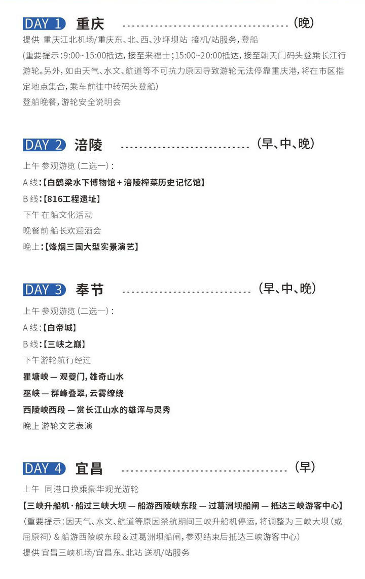 | ------------------------------------------------------------------------------------------------------ (一)费用包含项目: 1.游轮住宿:长江行游轮3 晚(下水)、4 晚(上水)住宿,含对应舱位标准配置。 2.餐饮服务:3 早5 正(下水),4 早7 正(上水),以及每日早咖啡及宵夜、全天候小食及指定酒水畅饮。 3.行李服务:将行李放置集散点的指定区域,会有专人负责清点、转运,直接搬运上船。 4.导游服务:配备随船专职讲解人员,各景区内配备专属导游提供讲解服务。 5.景点权益:行程所列景点门票(包含景区内必要接驳车、部分小交通费用)。 6.行程活动:行程中所含活动(不含明确的另付费增值项目等)。 7.保险保障:已含旅游意外保险,保障范围及保额以保险条款为准。 8.接驳交通:登/离船当日,提供重庆或宜昌机场/火车站⇄ 码头的接送站服务。 ①重庆接站:9:00~16:00 抵达大交通站点,接至来福士;16:00~20:00 抵达,接至朝天门码头登乘长江行游轮; ②宜昌接站:8:00~15:00 抵达大交通站点,接至宜昌市区三峡游客中心;15:00~20:00抵达,接至秭归港登乘长江行游轮; ③宜昌/重庆送站:离船当日,采取统一发车形式,提供集中送站服务。 (二)费用不含项目: 1.除“费用包含项目”中列明项目以外的其他费用。 2.不含登船日当天早餐、午餐,离船日当天午餐、晚餐。 3.不含个人旅行保险、往返出发地的交通费用(建议留足充裕的时间)。 4.不含自费游览项目、景区小交通,如:三峡之巅景区内索道等二销项目。 5.游轮航行期间的娱乐项目、购物消费、个性化增值服务(如SPA、专属摄影等)及其他未列明的个人开支。 | ||||