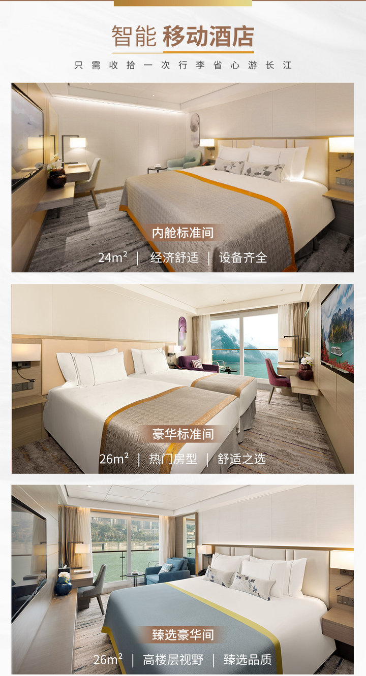 | 1. 以上价格为国内市场单人船票价格。臻选豪华间及套房类房型不接受0.5拼房预定。 2. 港澳台地区及其他国籍客人价格均在以上各类房型价格基础上加收500元/人,以上均不适用于美国、加拿大国籍客人。 3. 单房差:非套房类房型按单人价格75%收费,套房类房型按单人价格100%收费。单间楼层费荣耀级为400元/房/层。 4. 指定左/右舷,收取100元/房费用;指定房号,收取300元/房费用。 5. 成人加床:按单人价格75%收费(套房类房型仅总套可加床)。 6. 2-11岁儿童: 1)非套房类房型:占床按单人票价75%收费;不占床按单人价格50%收费,不收取楼层费;儿童加床在船票基础上加收300元加床费。 2)套房类房型:占床按单人票价100%收费;不占床按单人价格50%收费(包括家庭套第三人)。 3)1成人1儿童/婴儿出行,儿童/婴儿必须占床。 7. 2岁以下婴儿:不占床按单人价格10%收费,占床按儿童收费。 8. 游船服务费:以上价格不含游船服务费200元/人,港澳台及其他国籍客人随船票款一起支付。 世纪凯歌帕沃丽昂VIP餐厅升餐费用:下水执行498元/人,上水执行598元/人! 臻选房 尊享服务 VIP餐厅用餐、 世纪游轮2025年游船套房礼遇 (适用于荣耀级、神话级游轮渝宜线航次) 行政套房/家庭套房专享服务: 专享VIP餐厅用餐(荣耀/凯歌/绿洲4楼餐厅,神话/传奇6楼餐厅) 赠送船票行程内自选景点(未游览不退费) 专享观景俱乐部(适用于荣耀/凯歌/绿洲) 恒温游泳池畅游(适用于神话/传奇 ) 24小时行政酒廊专属服务 船长私人酒会 欢迎果盘 欢迎红酒 VIP开夜床服务 专属助眠饮品 世界名品洗浴套装 房间迷你吧 全程免费洗衣 总统套房专享服务项目: 专享VIP餐厅用餐(荣耀/凯歌/绿洲4楼餐厅,神话/传奇6楼餐厅) 赠送船票行程内自选景点(未游览不退费) 岸上观光专车专导 专属游轮管家服务 专享观景俱乐部(适用于荣耀/凯歌/绿洲) 恒温游泳池畅游(适用于神话/传奇) 24小时行政酒廊专属服务 船长私人酒会 欢迎红酒 VIP开夜床服务 专属助眠饮品 房间迷你吧 全程免费洗衣 用餐及演出留位 每日精美果盘 专享宝格丽洗浴套装 房间送餐服务 特色西餐一餐(荣耀可选择火锅 ) 套房政策 1、内舱、标间、臻选,儿童加床都是50%+300. 2、行政套、家庭套、绿洲套/凯歌套/荣耀套都不能加床。 3、家庭套住2人,家庭套单人价格*2 4、2大1小住家庭套,家庭套单人价格*2.5 5. 2大2小住家庭房2+0.5+0.5 6. 3个成人住家庭套房2.6 | ||||