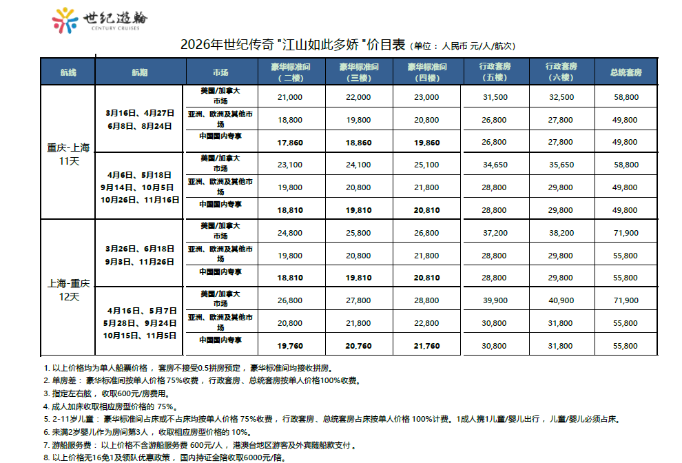 ![]() 1、 世纪传奇号船票:游轮 11 晚住宿; 2、 餐饮:游船期间所有用餐; 3、 酒水:在船上餐厅用餐以及酒吧指定时段,指定酒水畅饮; 4、 交通:登船当天重庆机场/火车站至重庆码头、离船当天上海码头至上海机场/火车站 接送车; 5、 导游:跟船讲解服务、景区导游讲解服务; 6、 景点:行程中景点门票(含景区内接驳车、小交通、索道); 7、 登船当日每房欢迎果盘一份; 注: 1、 根据季节、水位、天气、航道、政府禁令等情况,上述行程表中的抵达时间或景点可能会有相应 调整,请以游船每日发布的行程为准; 2、 如遇重庆码头调整,我司将统一安排乘船客人乘车中转至码头登船,如遇此情况请积极配合游船 中转工作安排。 |